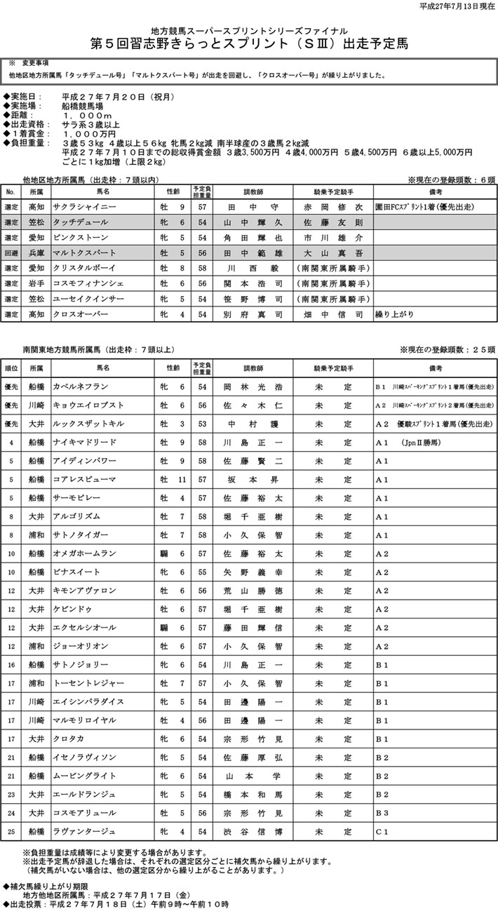 【7月13日更新】第5回習志野きらっとスプリント【7月20日(祝月)】出走予定馬(PDF)