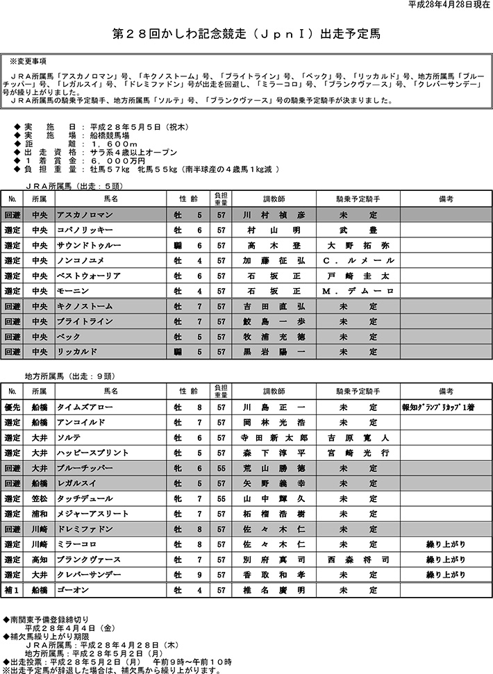 【4月28日更新】第28回かしわ記念競走【5月5日(祝木)】出走予定馬(PDF)