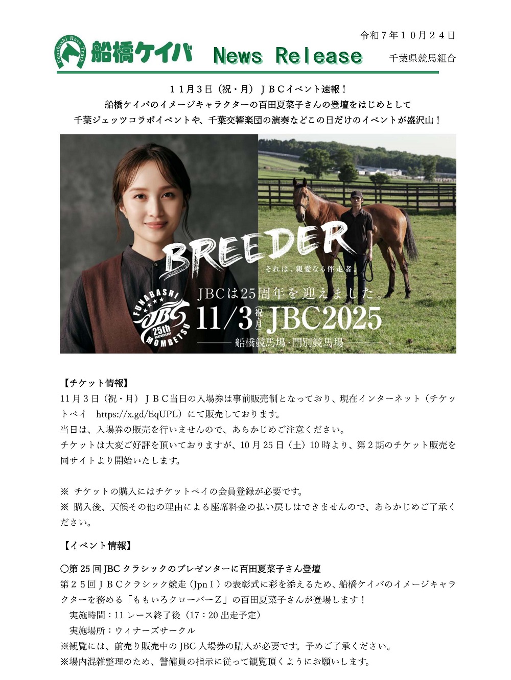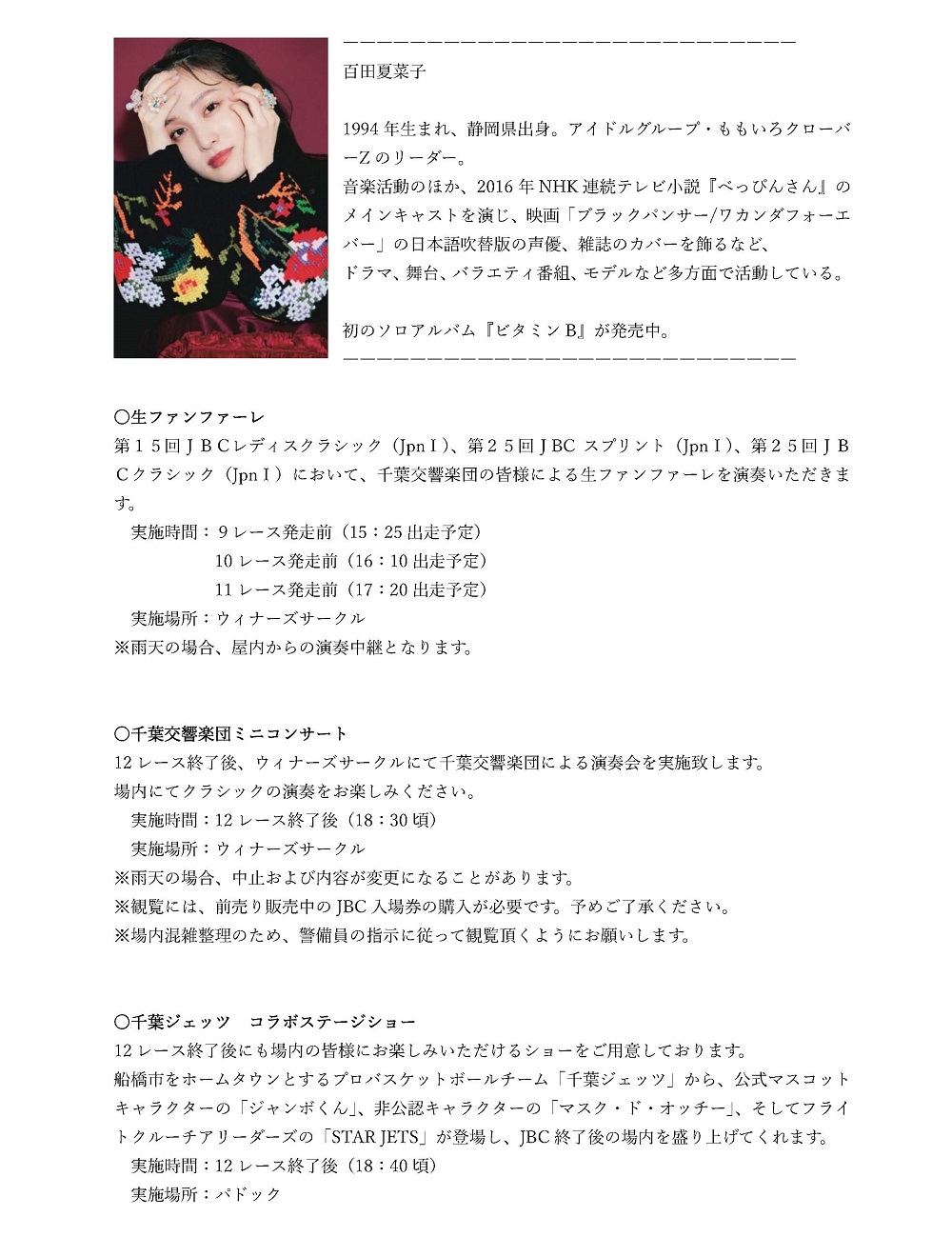 11月3日(祝・月)JBCイベント速報!船橋ケイバのイメージキャラクターの百田夏菜子さんの登壇をはじめとして千葉ジェッツコラボイベントや、千葉交響楽団の演奏などこの日だけのイベントが盛沢山!