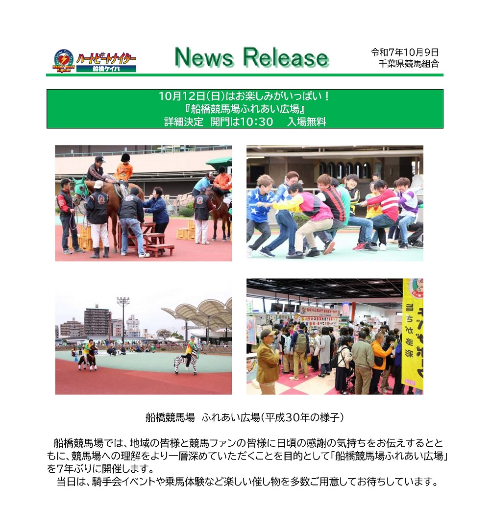 10月12日(日)はお楽しみがいっぱい! 『船橋競馬場ふれあい広場』詳細決定 開門は10:30 入場無料