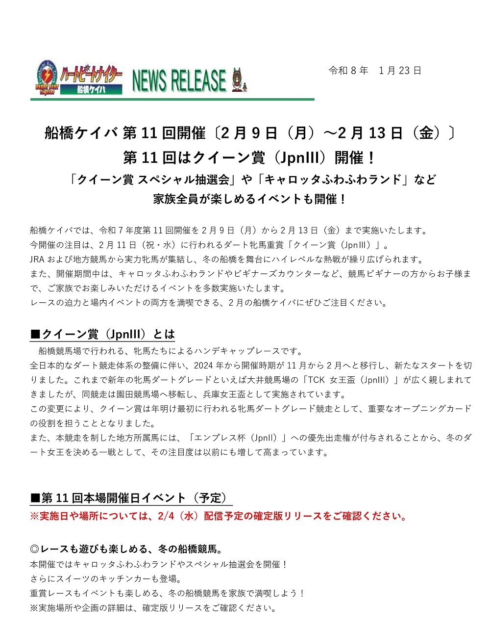 船橋競馬 第11回開催〔2月9日(月)~2月13日(金)〕イベント情報【速報】