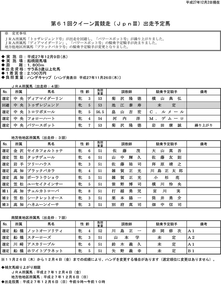 【12月3日更新】第61回クイーン賞競走【12月9日(水)】出走予定馬(PDF)