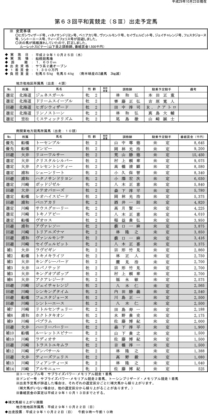 平成29年10月25日(水)に実施した第63回 平和賞(SIII)の着順が確定しましたのでお知らせいたします。