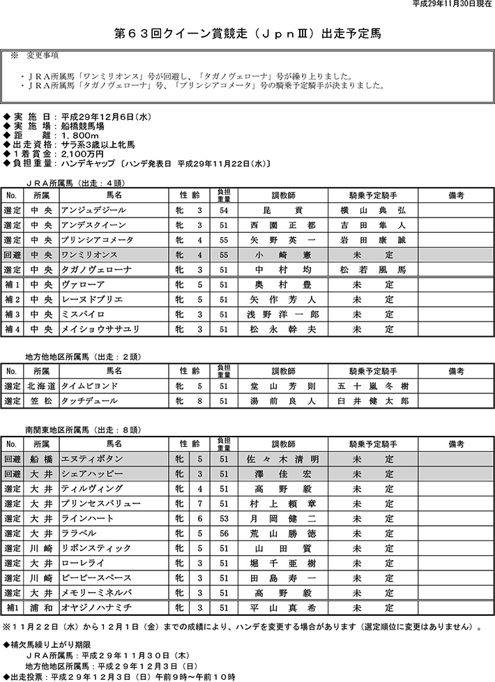 【11月30日更新】第63回クイーン賞競走(JpnIII)出走予定馬(PDF)