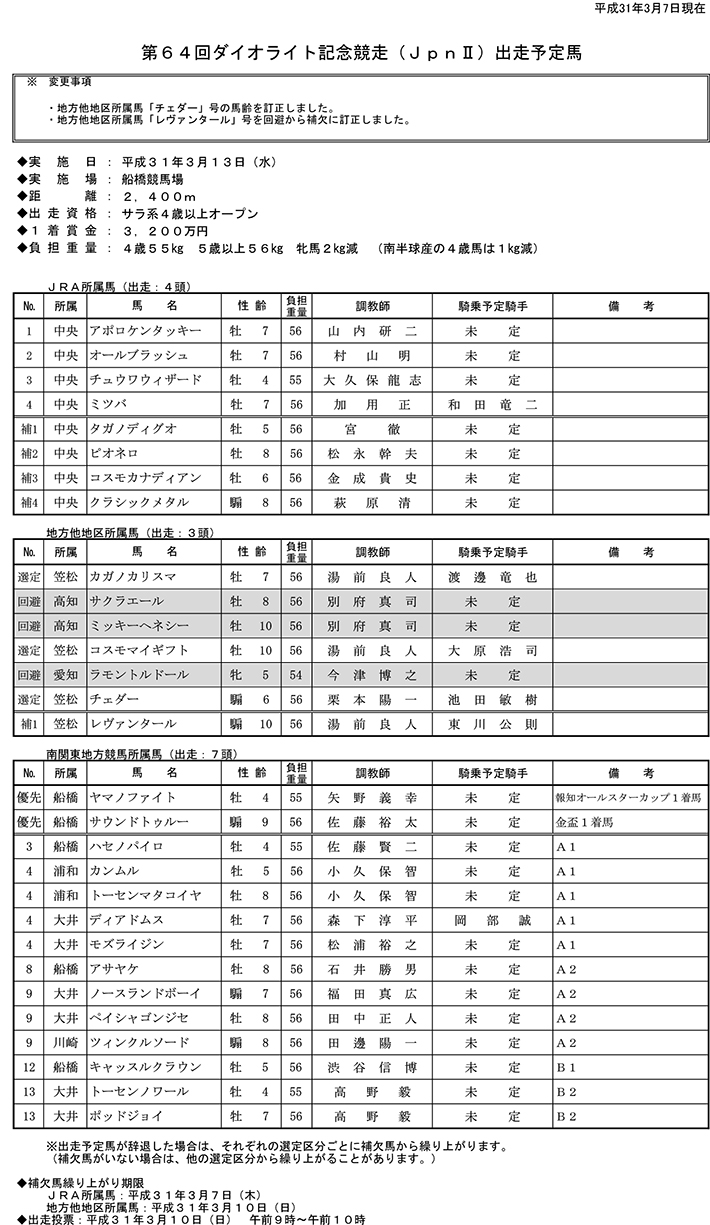 【3月7日更新】第64回ダイオライト記念競走(JpnII)出走予定馬(PDF)