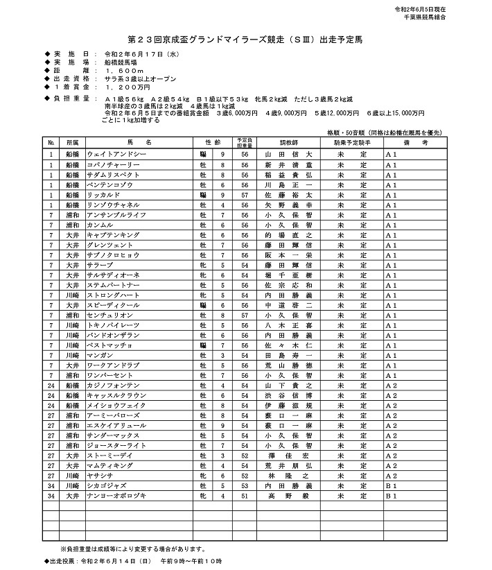 6月17日(水)に実施いたします「第23回京成盃グランドマイラーズ競走(SIII)」の出走予定馬につきましてお知らせいたします。