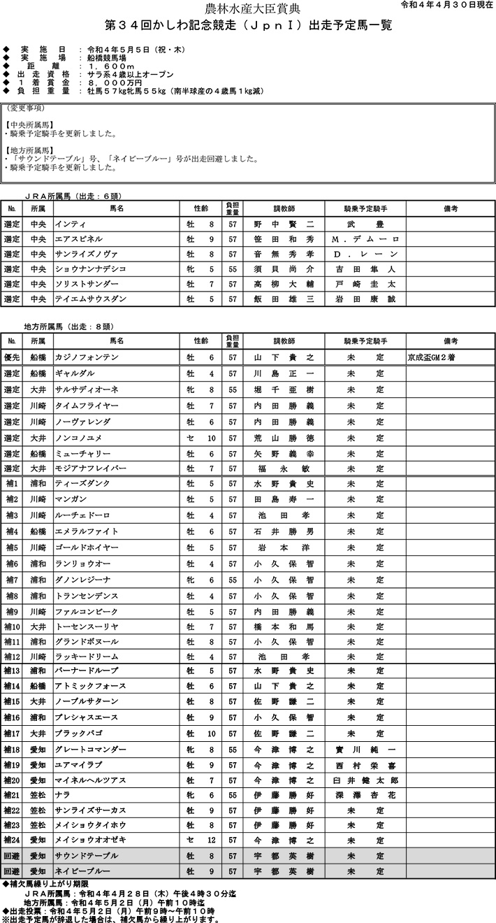 【4月30日更新】第34回かしわ記念競走(JpnI)出走予定馬一覧(PDF)