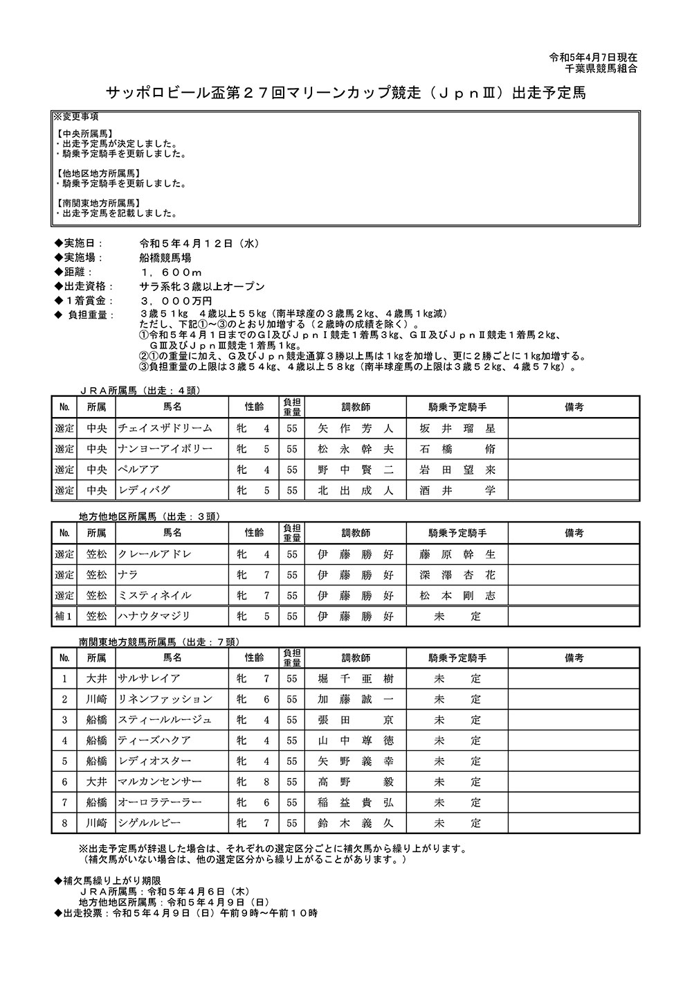 【4月7日更新】サッポロビール盃第27回マリーンカップ競走(JpnIII)出走予定馬(PDF)