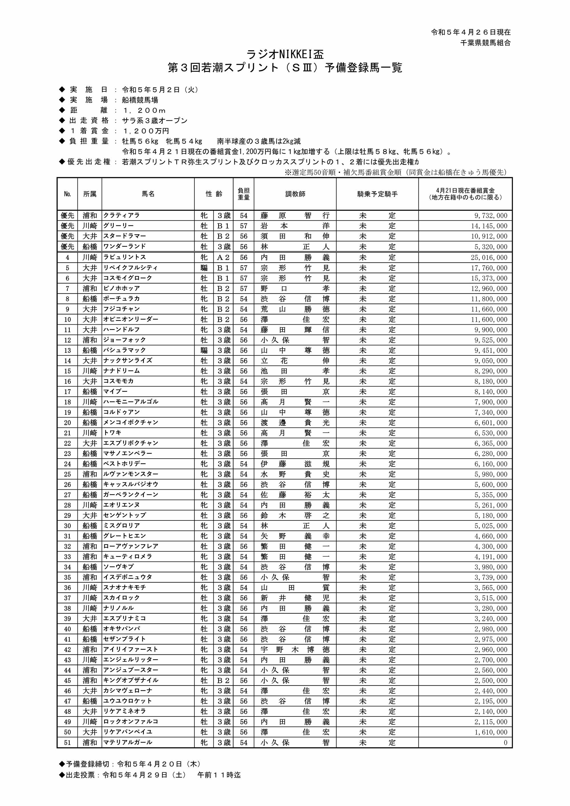 【4月27日更新】第3回若潮スプリント(SIII)出走予定馬(PDF)