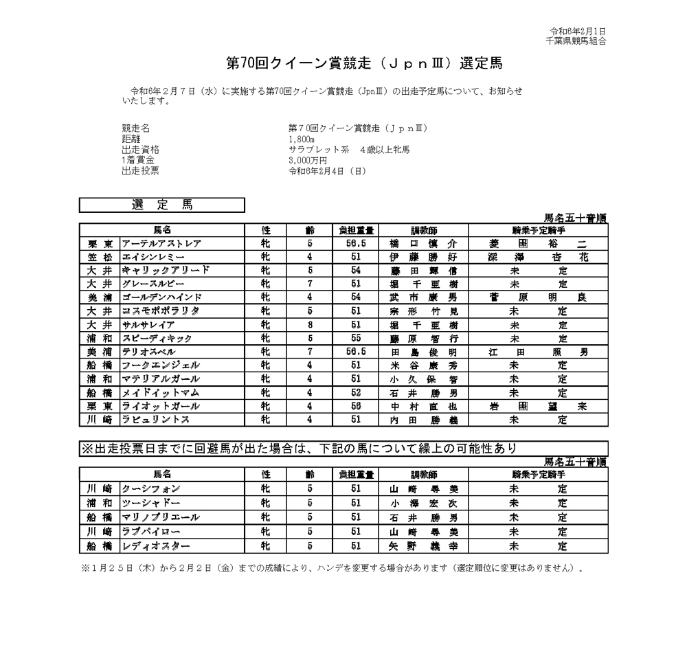 第70回クイーン賞競走(JpnIII)出走予定馬(PDF)[2月1日更新]