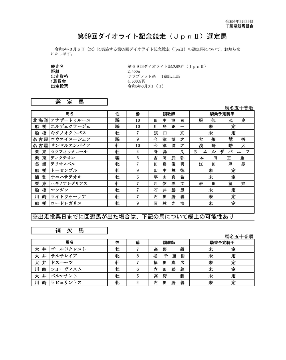 第69回ダイオライト記念競走(JpnII)出走予定馬(PDF)[2月29日更新]