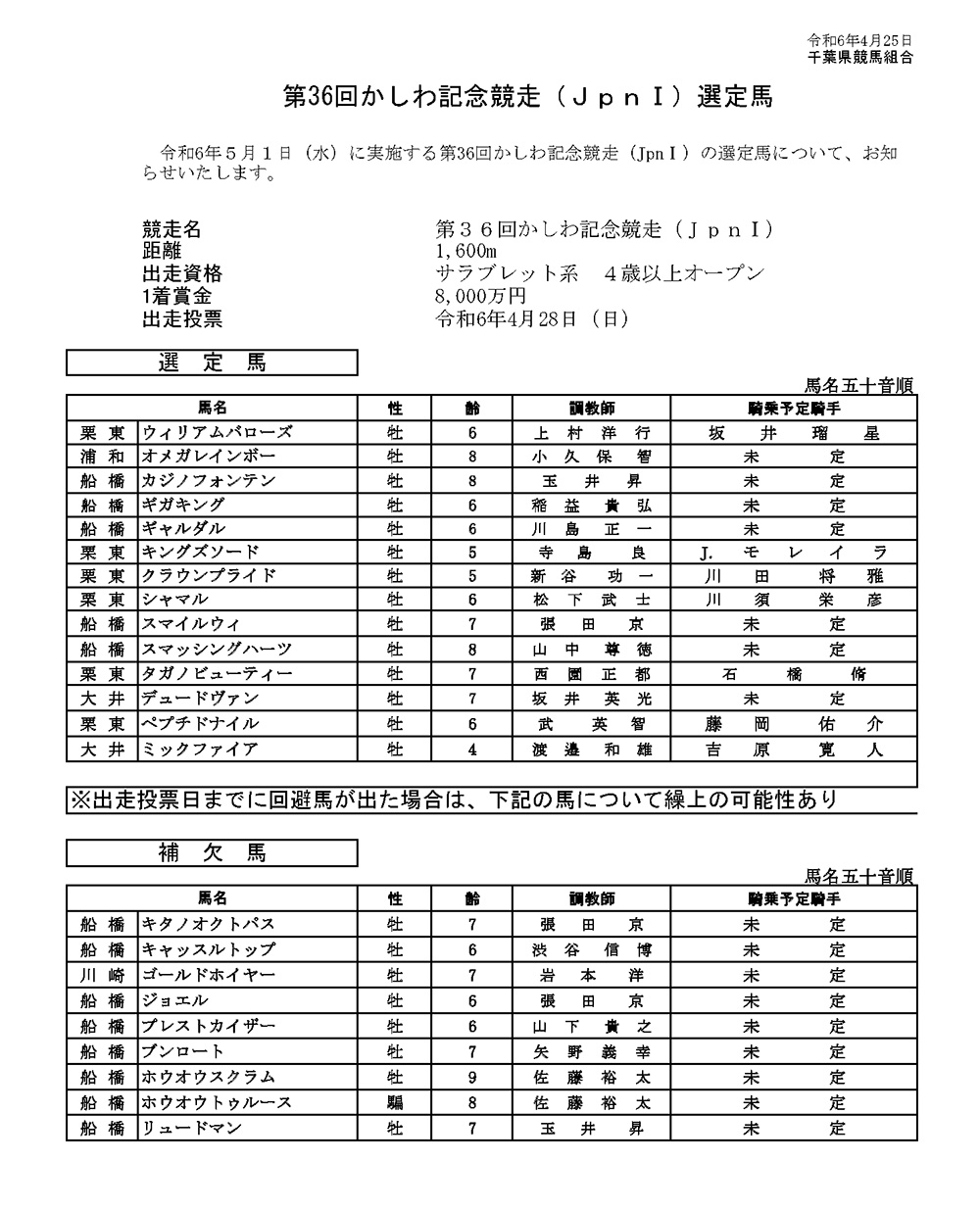 第36回かしわ記念競走(JpnI)出走予定馬(PDF)[4月25日更新]