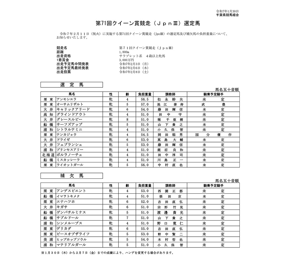 第71回クイーン賞競走(JpnIII)出走予定馬(PDF)[1月30日更新]