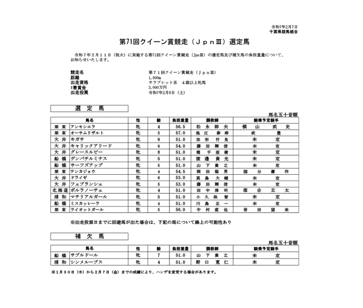 第71回クイーン賞競走(JpnIII)出走予定馬(PDF)[2月7日更新]