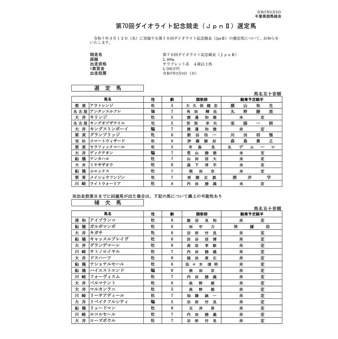 第70回ダイオライト記念競走(JpnII)出走予定馬(PDF)[3月6日更新]