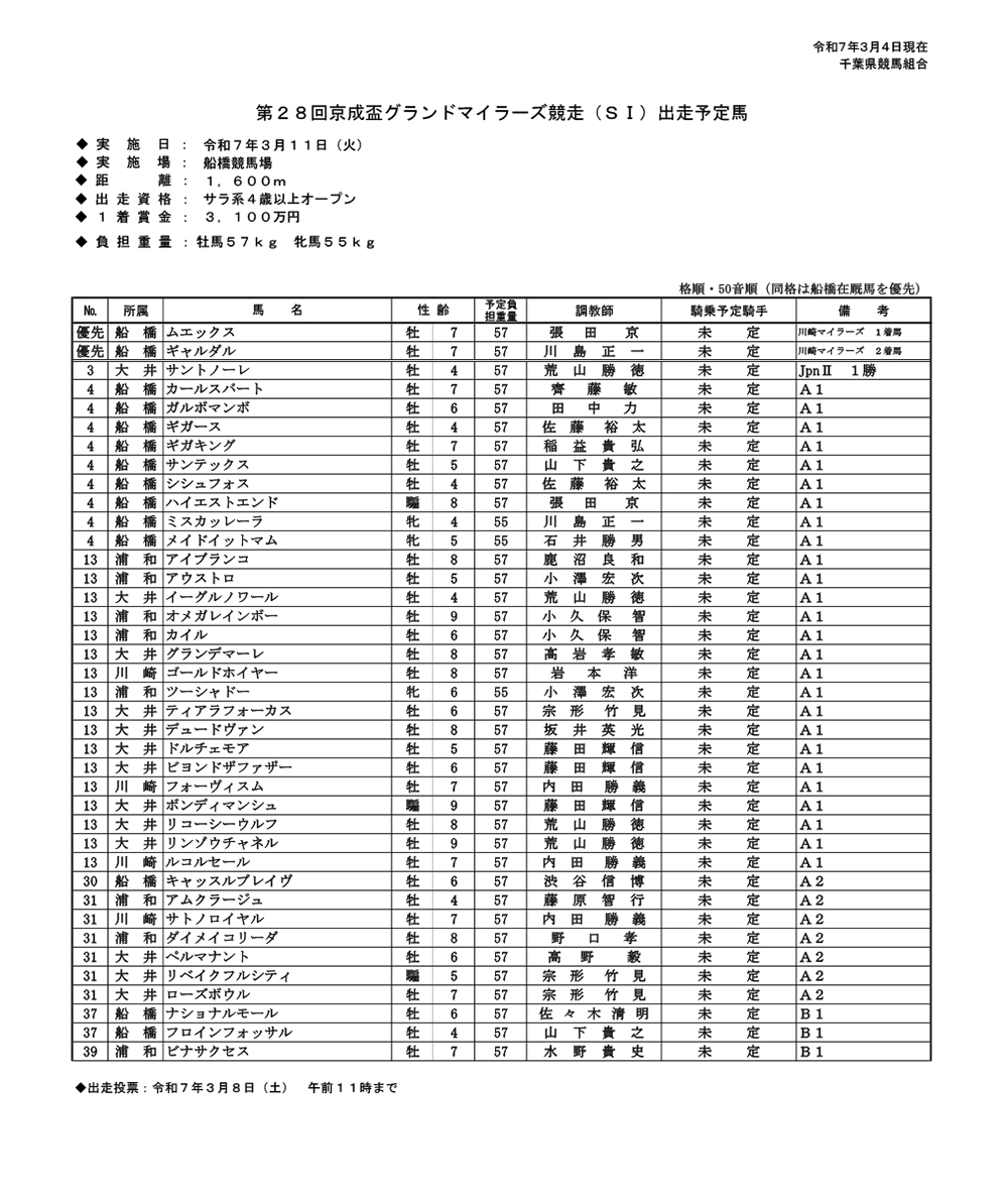 3月11日(火)に実施いたします「第28回京成盃グランドマイラーズ競走(SI)」の出走予定馬につきましてお知らせいたします。