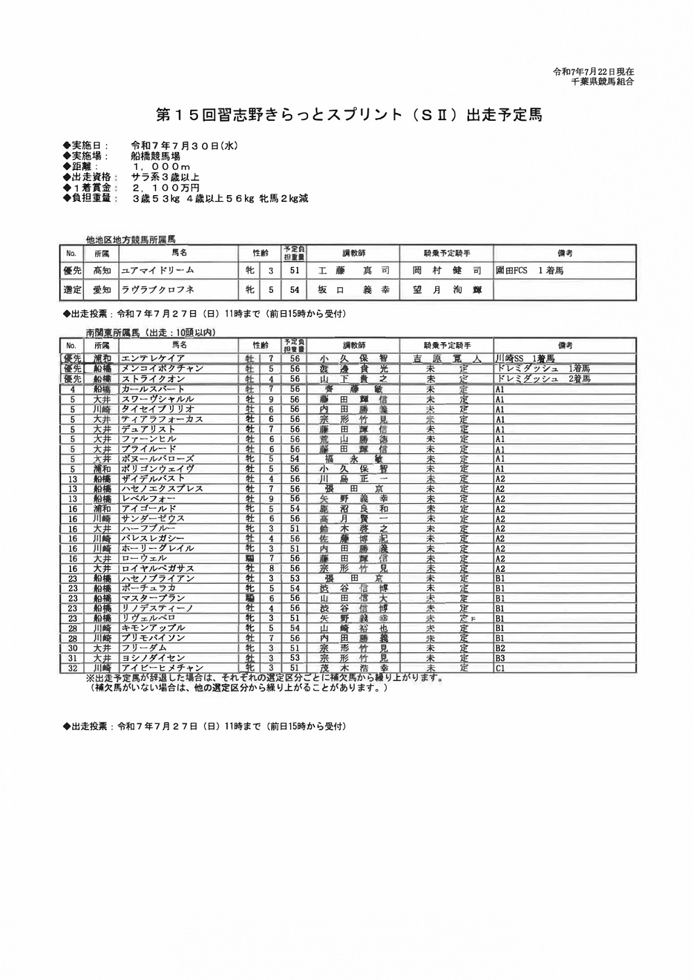 7月30日(水)に実施いたします「第15回習志野きらっとスプリント(SII)」の出走予定馬につきましてお知らせいたします。