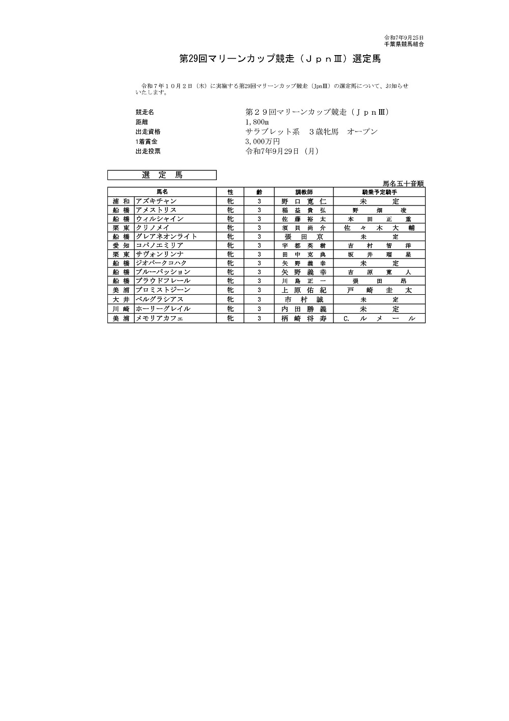 第29回マリーンカップ競走(JpnIII)出走予定馬(PDF)[9月25日更新]