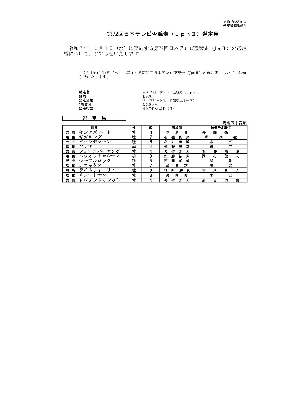 第72回日本テレビ盃競走(JpnII)出走予定馬(PDF)