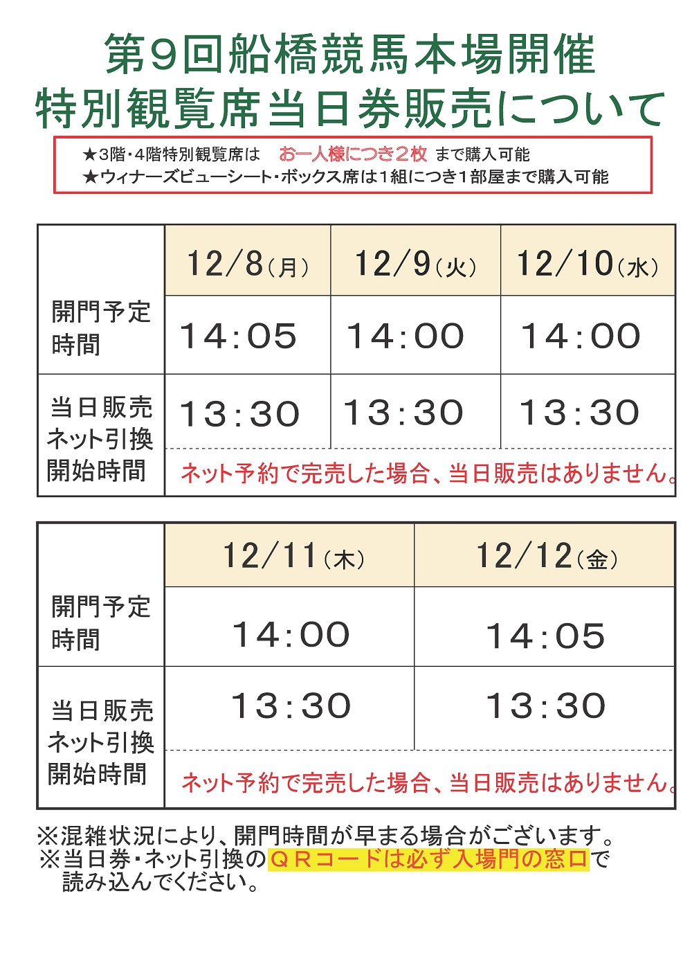 12/8~12/12船橋競馬本場開催特別観覧席当日券販売について
