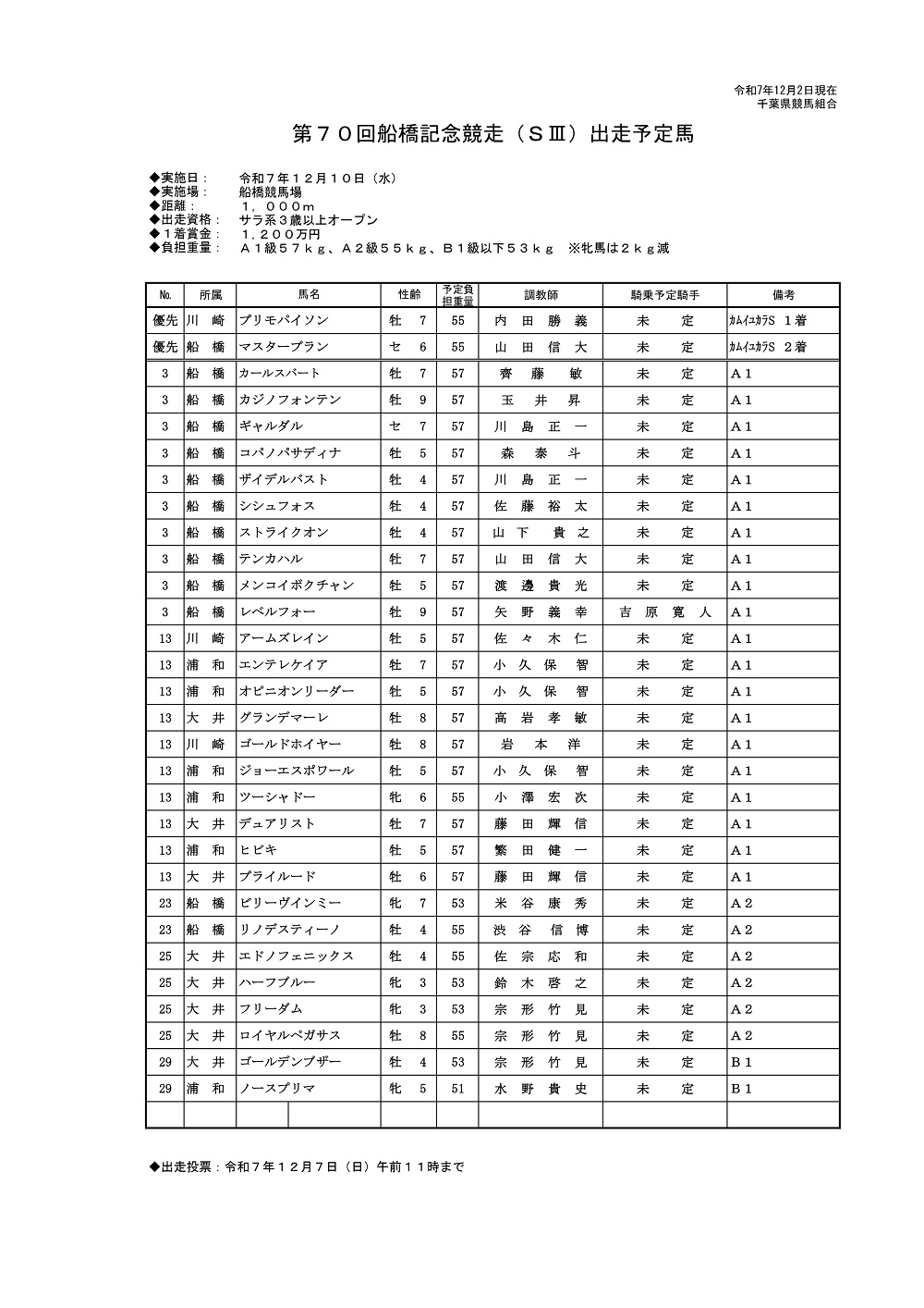 第70回船橋記念競走(SIII)出走予定馬(PDF)