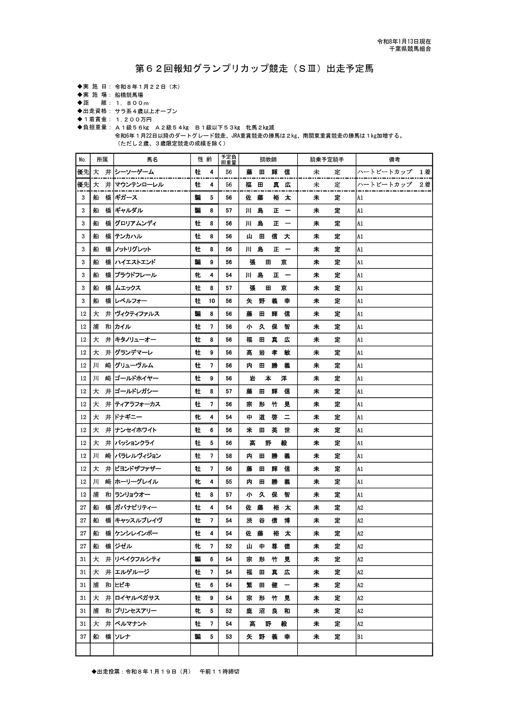 船橋ケイバ重賞競走特集に1月21日(水)に実施されます「第52回 ブルーバードカップ(JpnIII)」、1月22日(木)に実施されます「第62回 報知グランプリカップ(SIII)」を掲載いたしました。