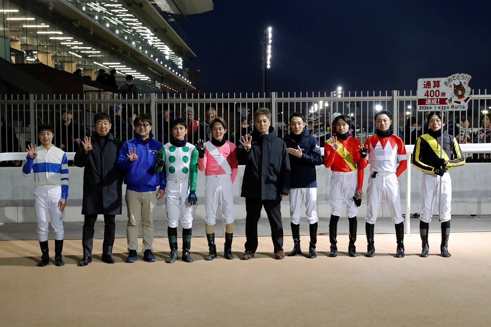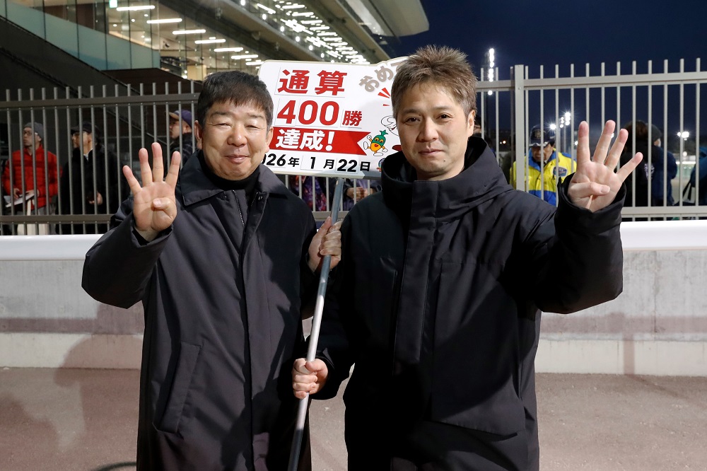 船橋競馬場所属 稲益 貴弘(いなます たかひろ)調教師が、令和8年1月22日(木)の令和7年度第10回船橋競馬第4日第6レースにおいて、管理馬「サッポロキタコ号」で通算400勝を達成しましたのでお知らせします。