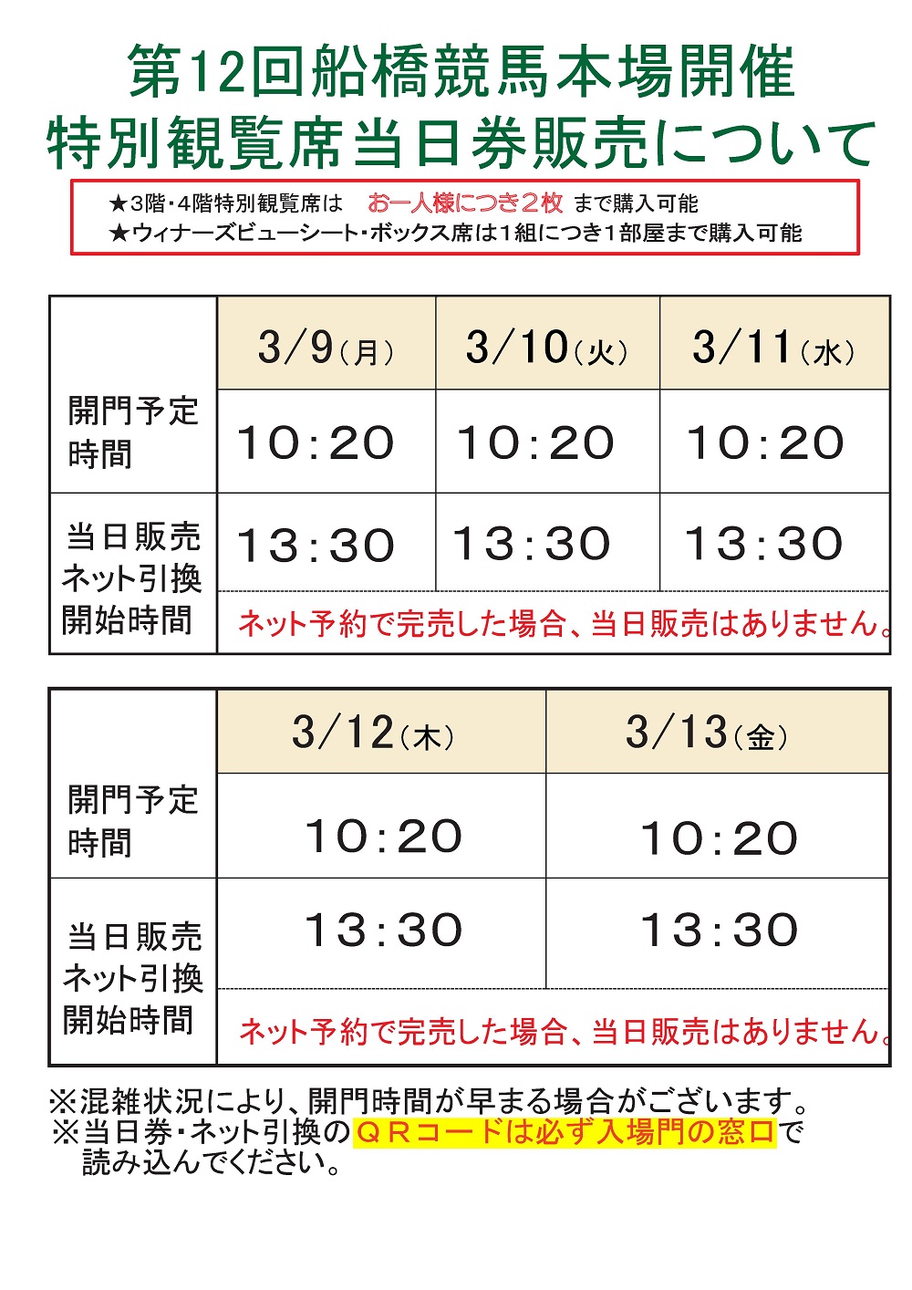 3/9~3/13船橋競馬本場開催特別観覧席当日券販売について