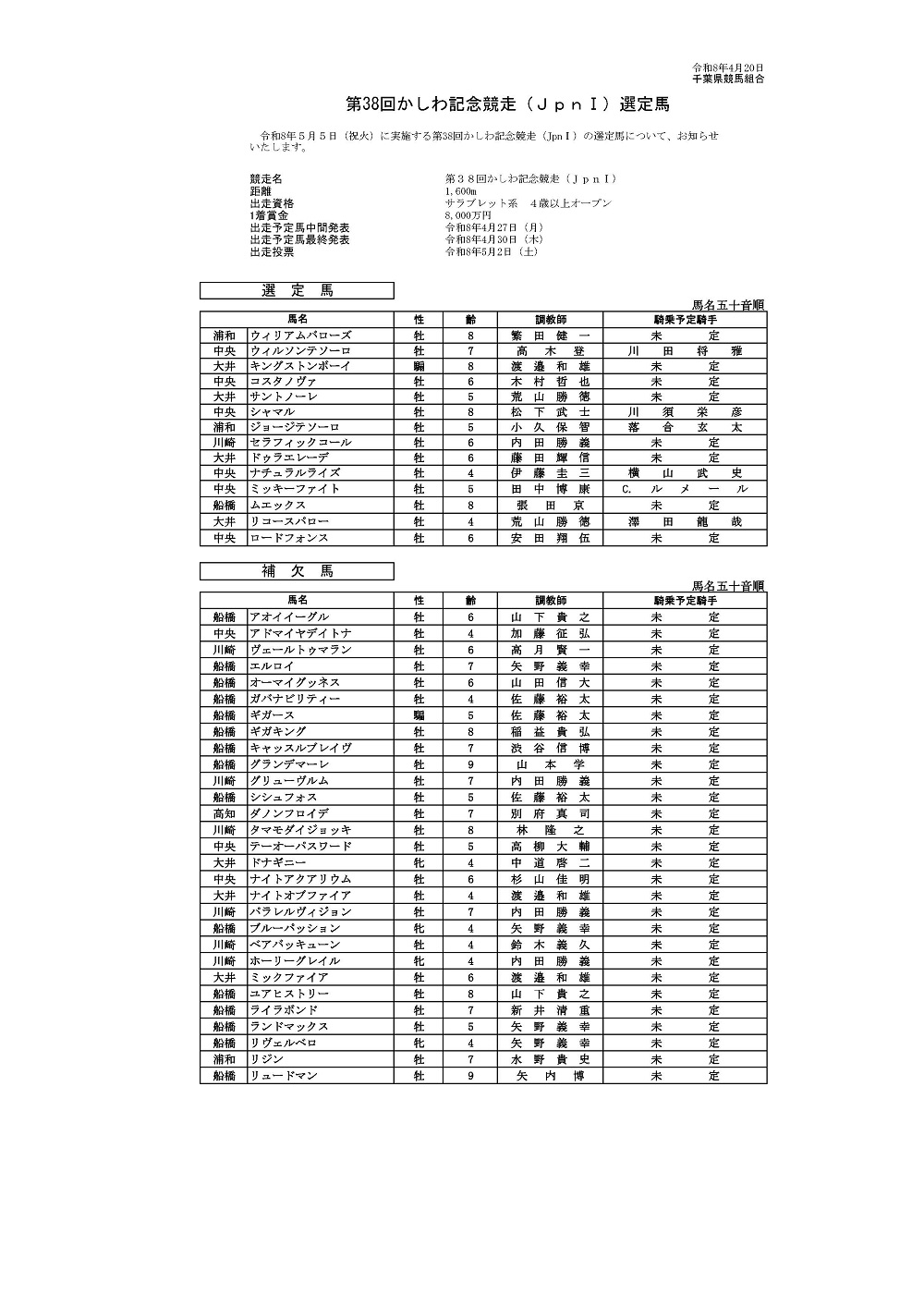 令和8年5月5日(祝火)に実施する第38回かしわ記念競走(JpnI)の選定馬について、お知らせいたします。