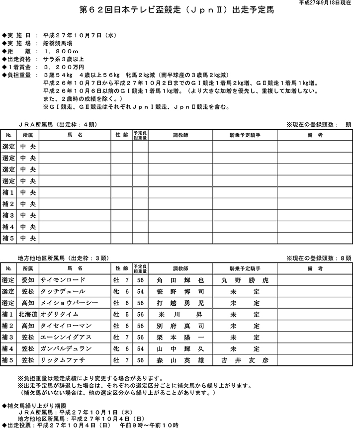 第62回日本テレビ盃競走【10月7日(水)】出走予定馬(PDF)