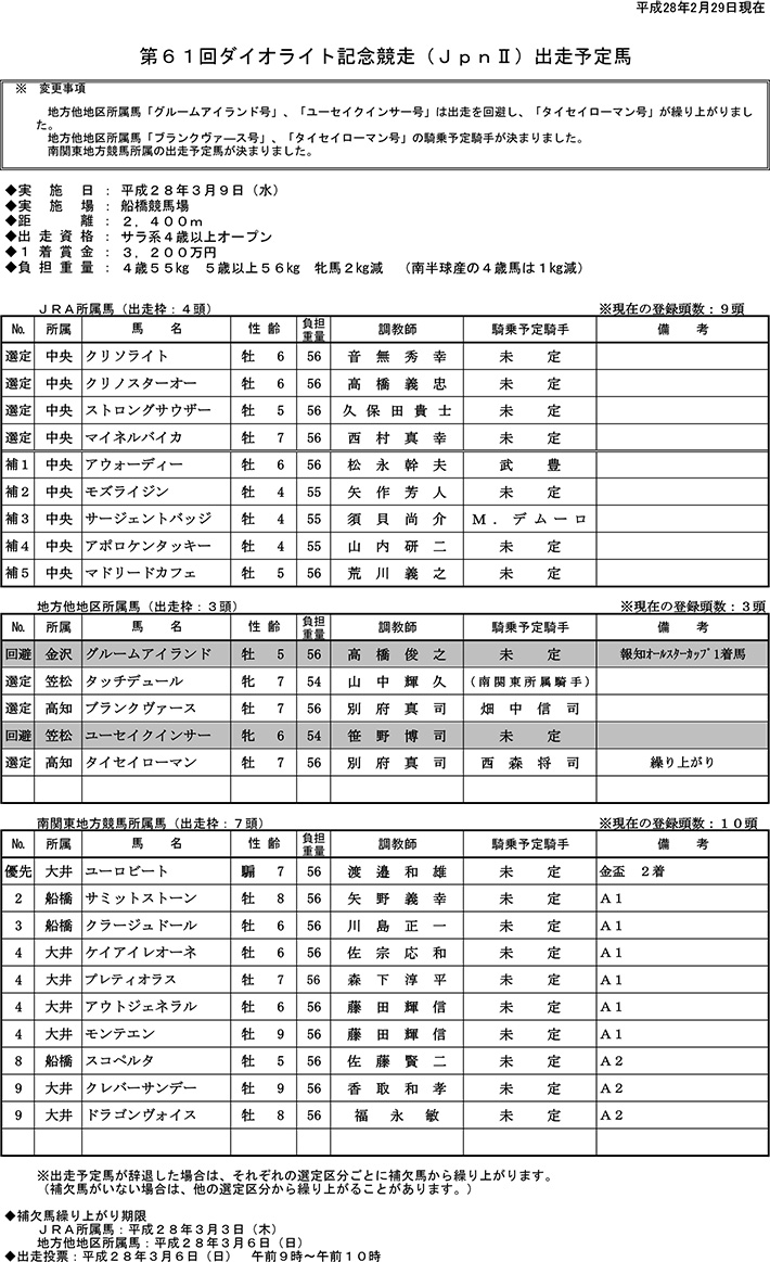 【2月29日更新】第61回ダイオライト記念競走【3月9日(水)】出走予定馬(PDF)