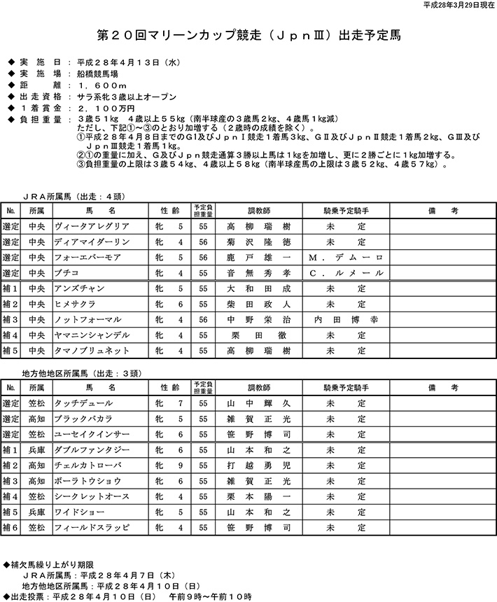 第20回マリーンカップ競走【4月13日(水)】出走予定馬(PDF)