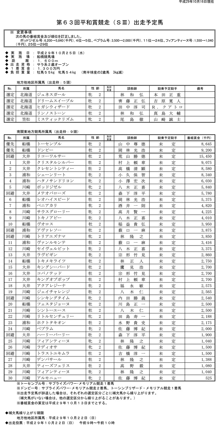 第63回平和賞(SIII)出走予定馬(PDF)