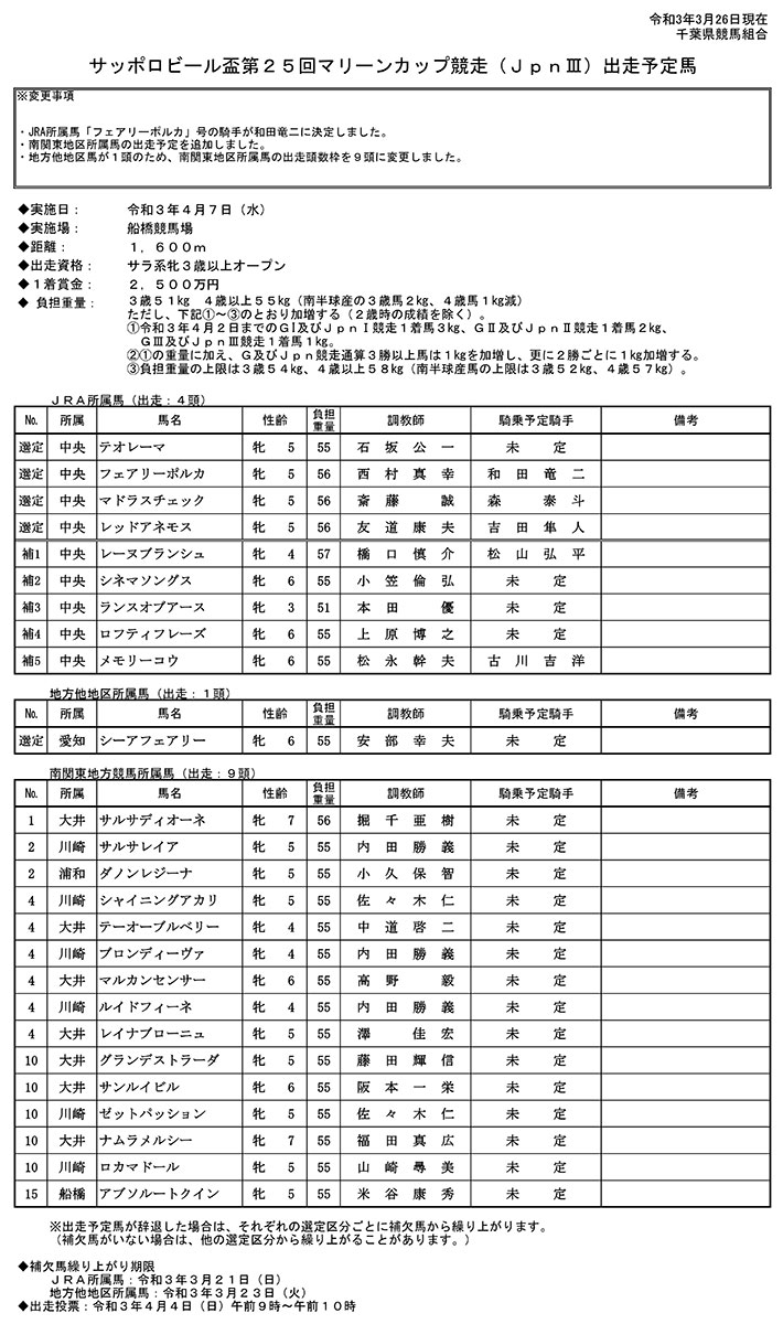 【3月26日更新】サッポロビール盃第25回マリーンカップ競走(JpnIII)出走予定馬(PDF)