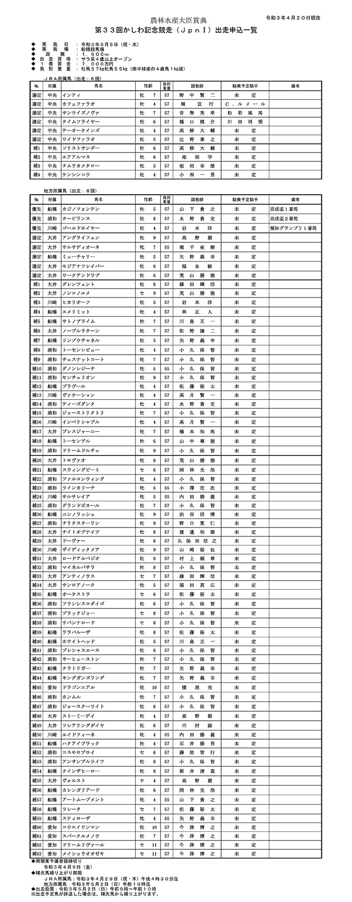 第33回かしわ記念競走(JpnI)出走予定馬(PDF)