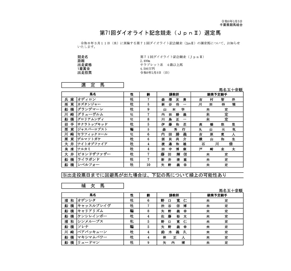 第71回ダイオライト記念競走(JpnII)出走予定馬(PDF)[3月5日更新]