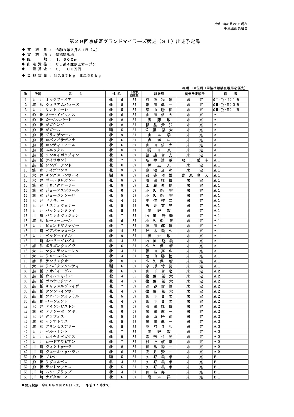 令和8年3月31日(火)に実施いたします「第29回京成盃グランドマイラーズ(SI)」の出走予定馬につきましてお知らせいたします。